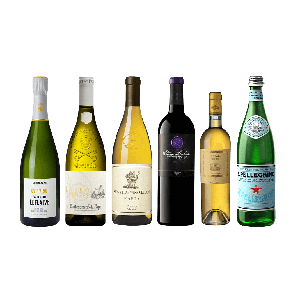 Een heerlijk wijn arrangement van 5 wijnen en 1 water samengesteld door onze eigen sommelier Sermad, speciaal voor het Kerst Take-Away menu.